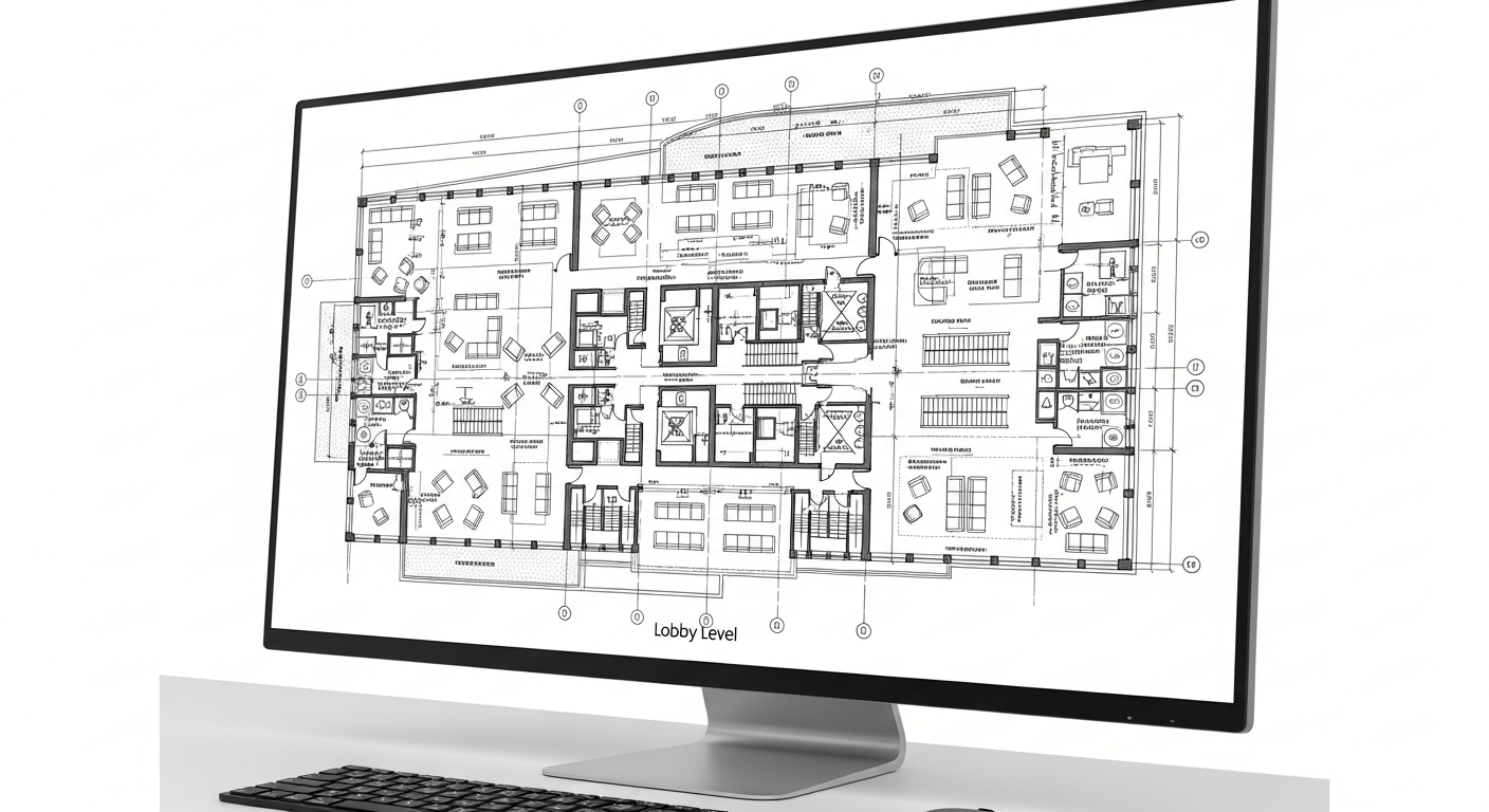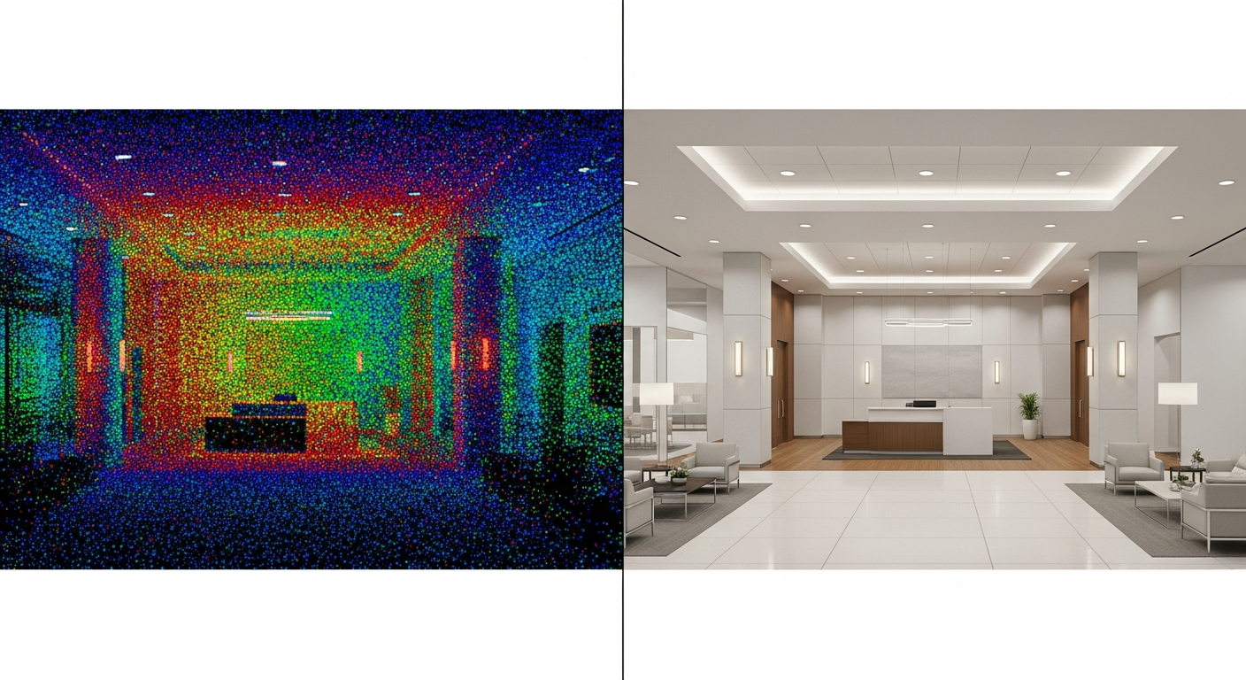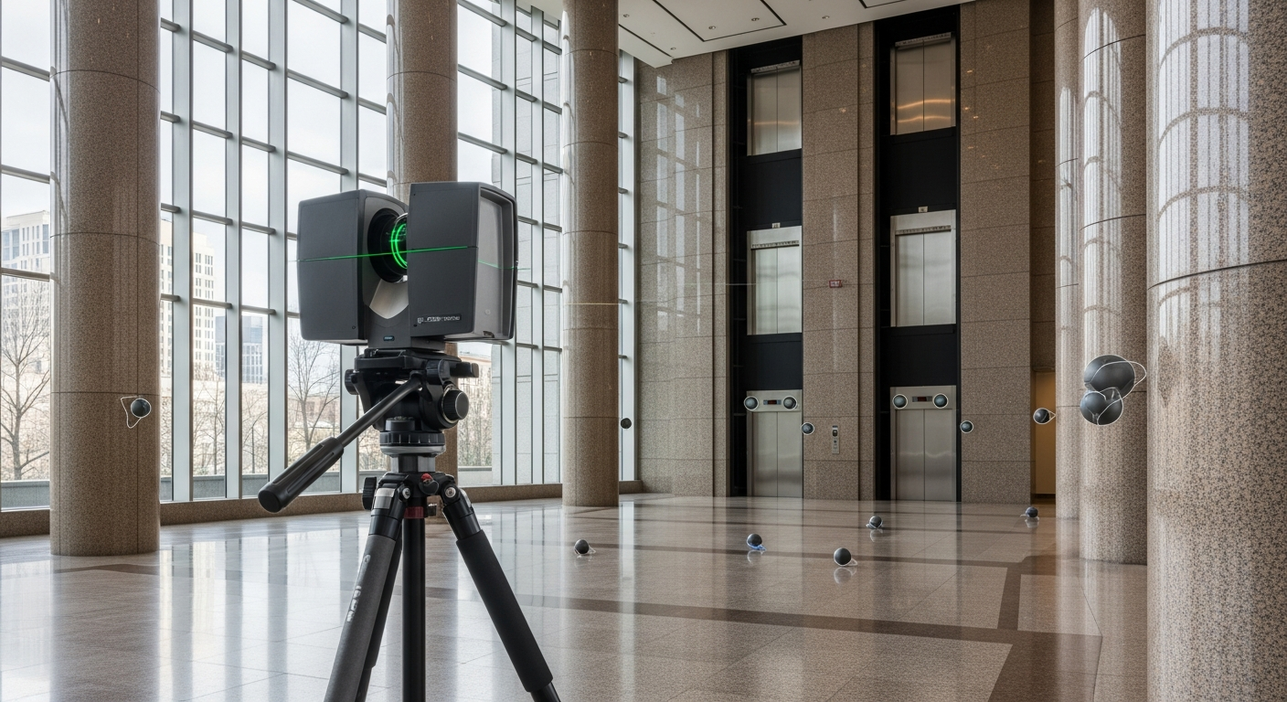 We scanned all three levels of the lobby and common areas over a weekend to minimize tenant disruption. Using 36 scan positions, we captured the full geometry including structural columns, curtain wall mullion patterns, floor-to-ceiling heights, elevator core dimensions, and existing MEP routing in the ceiling plenum. The deliverable was a fully dimensioned AutoCAD floor plan set and a Revit architectural model that the design team used as the base for their renovation drawings.