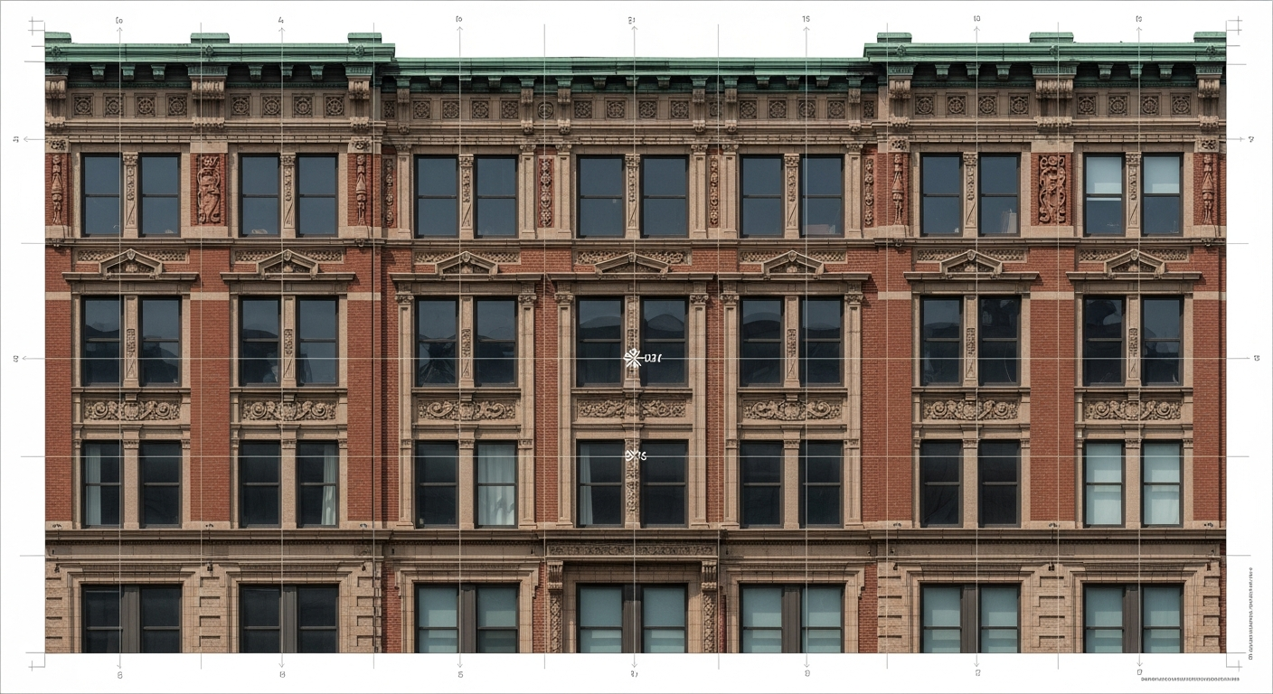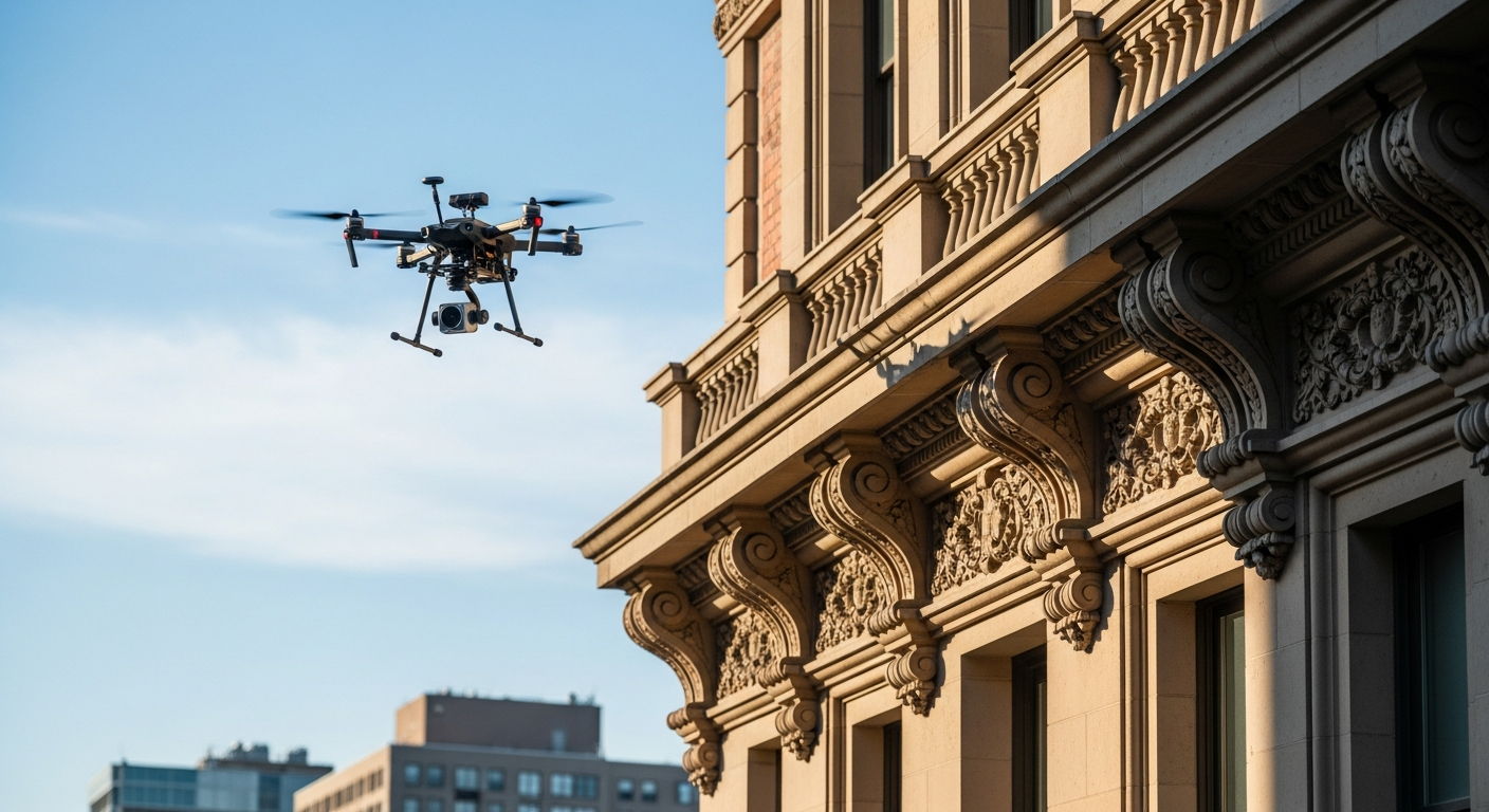 We combined terrestrial LiDAR scanning with drone-mounted photogrammetry to capture all four facades from ground level to parapet. The terrestrial scans provided millimeter-accurate geometry of the ornamental details, while the drone captured the upper levels and roofline that were inaccessible from the ground. The data was processed into detailed facade elevation drawings with dimensions, an orthorectified photo mosaic for condition documentation, and 3D models of the ornamental elements that could be used for replication if needed.